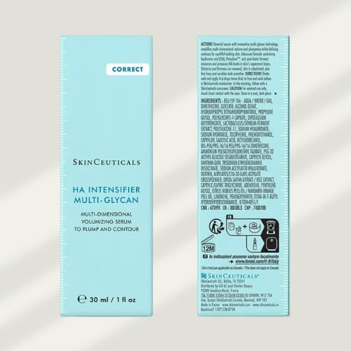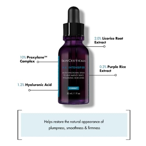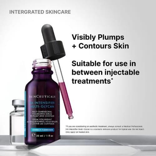 SkinCeuticals Hyaluronic Acid Intensifier Multi-Glycan is a multi-benefit corrective serum designed to boost the skin’s natural hyaluronic acid levels by up to 30%. Formulated with a high concentration of pure hyaluronic acid, Proxylane™, and botanical extracts of liquorice root and purple rice, this serum restores hydration, improves skin texture, and enhances firmness and facial plumpness. Its lightweight, gel-like texture delivers long-lasting hydration and a smoother, radiant complexion. Suitable for all skin types, including use following dermal filler treatments (consult your clinician for personalised advice).
