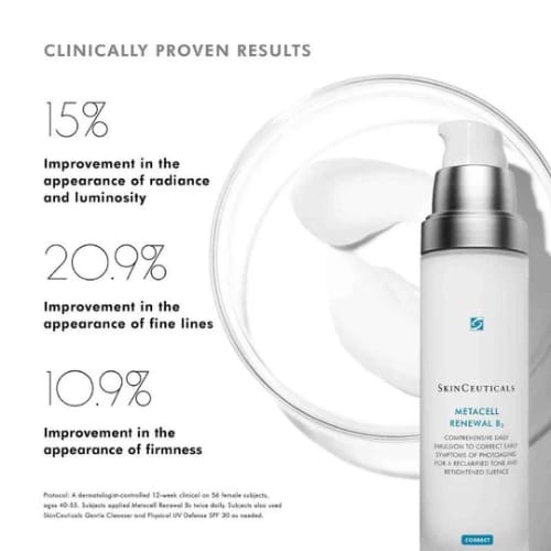 SkinCeutical Metacell Renewal B3 is a lightweight, advanced daily emulsion designed to correct early signs of photo-ageing and improve skin tone, firmness, and elasticity. Enriched with Niacinamide (Vitamin B3), firming tripeptides, and glycerin, it enhances epidermal cell turnover, strengthens the skin barrier, and delivers deep hydration for a smoother, radiant complexion.