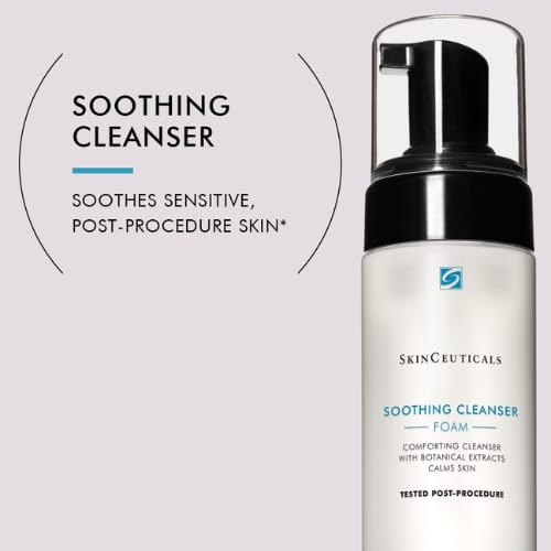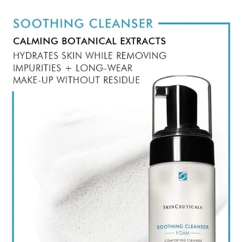 SkinCeuticals Soothing Cleanser is a gentle foaming cleanser designed to remove impurities and long-wear makeup while soothing and hydrating sensitive or compromised skin. Enriched with a high-concentration blend of botanical extracts and humectants, it restores comfort and moisture with every wash. Ideal for daily use and suitable for post-treatment care on healed skin.